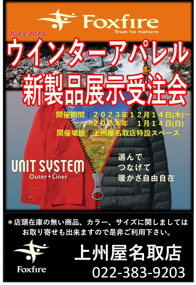 2023年12月14日(木)~2024年1月14日(日)の期間中、上州屋名取店にて人気アウトドアブランド、FoxFire(フォックスファイヤー)のウインターアパレル展示受注会を開催します!
