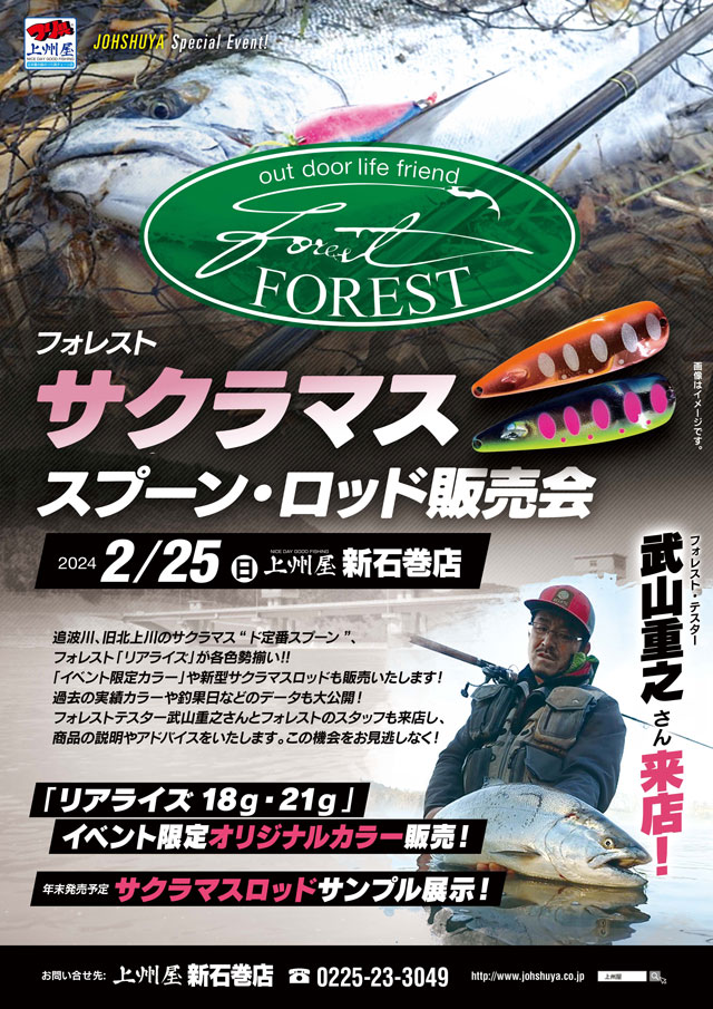また、当日11:00~16:00の時間帯にはフォレスト・テスター武山重之さんがサクラマス攻略店頭アドバイザーとして来店予定です!