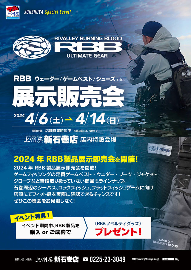 2024年4月6日(土)~14日(日)の9日間、上州屋新石巻店にてRBBウェーダー、ゲームベスト、シューズetc.の展示即売会を開催します!