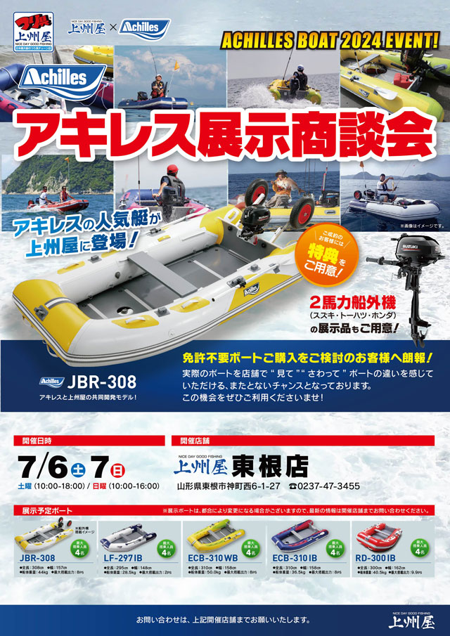 の2日間、上州屋東根店にてアキレス2024免許不要ボートの店頭展示商談会を開催します。