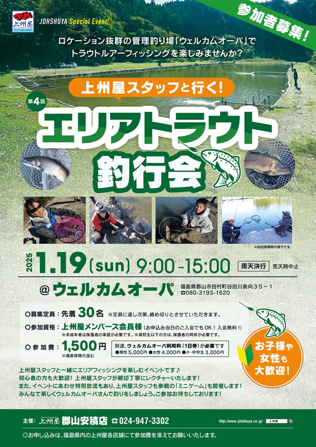 2025年1月19日(9:00~15:00予定、福島県郡山市の管理釣り場「ウェルカムオーパ」にて「第4回上州屋スタッフと行くエリア釣行会 in ウェルカム・オーパ」を開催します!