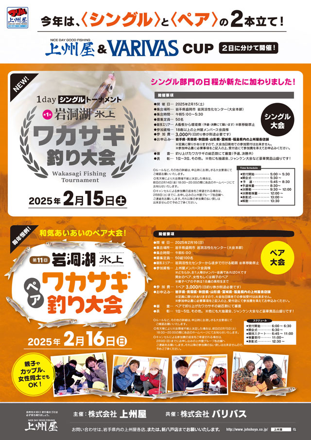 今年はシングルとペアの2本立て!2025年上州屋&バリバスCUP 岩洞湖氷上ワカサギ釣り大会は、2月15日()シングル部門2月16日()ペア部門、2日間に分けて開催いたします!