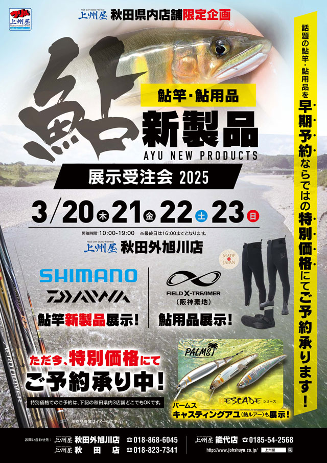 なお、只今秋田県内3店では上記展示会前にご予約頂いても【展示会特別価格&特典】にてお求め頂ける事前予約を承っております。年々確保が難しくなっている鮎竿&鮎用品、気になる製品のある方は早めのご相談を各店にてお待ちしております!