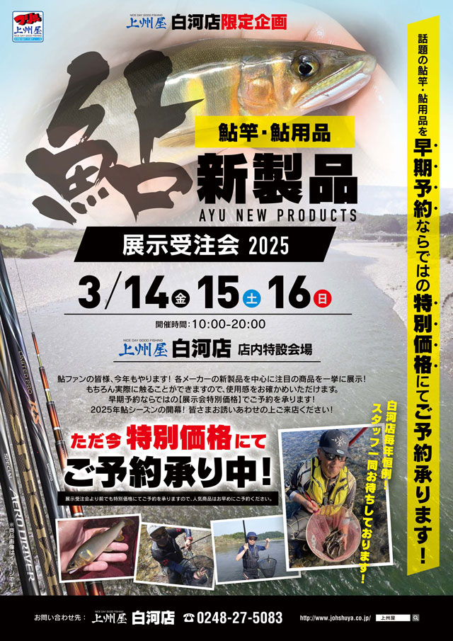 2025年3月14日(金)、15日(土)、16日(日)の3日間、上州屋白河店にてSHIMANO・DAIWA鮎2025新製品展示受注会を開催します!