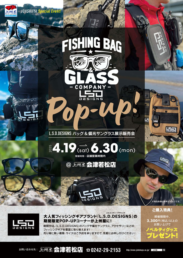 2025年4月19日(土)~6月30日(月)の期間中、上州屋会津若松店にLSDデザインズのフィッシングバッグ&偏光サングラスetc.の特設ポップアップコーナーが登場!