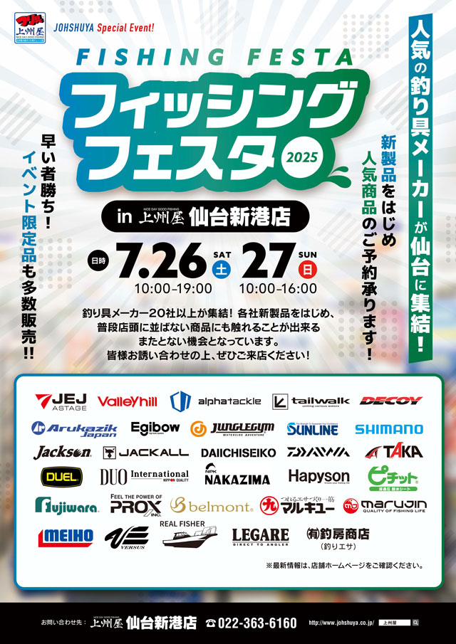 上記2日間、上州屋仙台新港店に釣り具メーカー20社以上が集結!各社新製品をはじめ、普段店頭に並ばない商品にも触れることができる、またとない機会です。皆様お誘い合わせの上、是非ご来店ください。