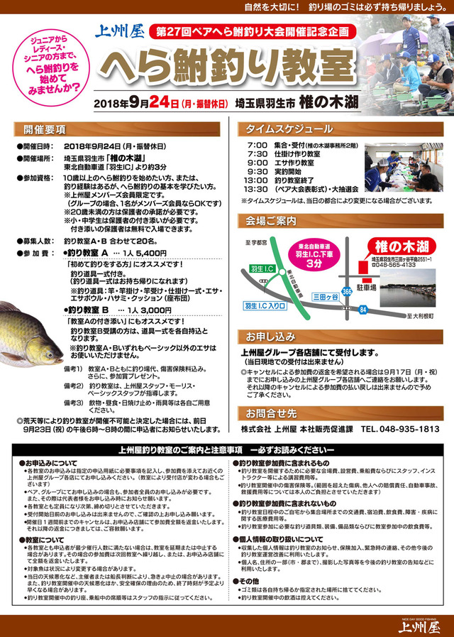 ※釣り教室当日、現地での参加お申し込み受付は出来ません。※荒天等により教室開催不能と決定した場合は、前日の午後6:00~8:00の間に電話にて申込者にお知らせいたします。※キャンセルによる参加費の返金をご希望される場合は、2018年9月17日(月/祝)までにお申込みの上州屋グループ各店舗へご連絡をお願いします。それ以降の参加費の払い戻しは出来ませんので予めご了承下さい。