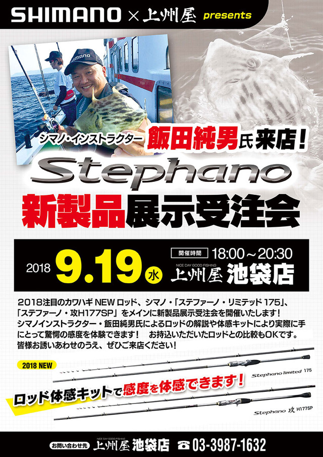 2018年9月19日(水)18:00~20:30、上州屋池袋店にてシマノカワハギ、2018新製品ロッド展示受注会を開催します!注目の新製品「ステファーノ・リミテッド175」、「ステファーノ・攻H177SP」を見て触って、プロの解説付きで体感頂けます!