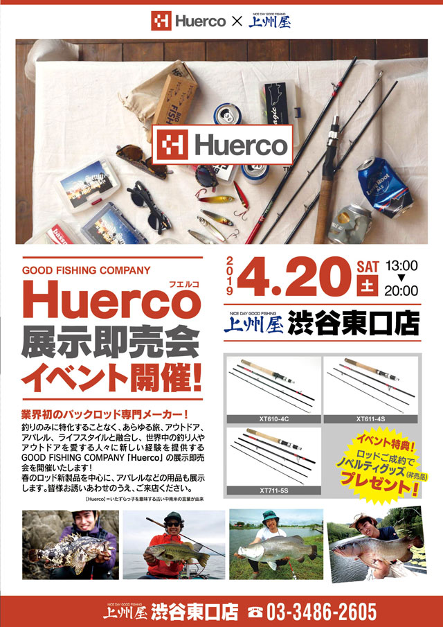 2019年4月20日(土)13:00~20:00(予定)、上州屋渋谷東口店にて業界初のパックロッド専門メーカー『Huerco(フエルコ)』の展示即売会を開催します!