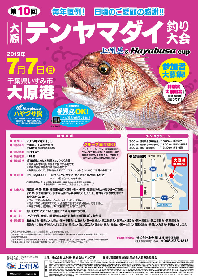 2019 年7月7日(日)、千葉県いすみ市大原漁港にて「第10回大原テンヤマダイ釣り大会 上州屋&ハヤブサCUP」開催!年間を通して数多くの大鯛が釣りあがる豊穣の海で自慢の腕を競って下さい!