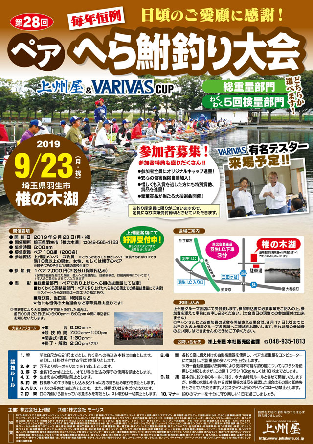 2019年9月23日(月/)、埼玉県羽生市、椎の木湖にて「第28回ペアへら鮒釣り大会 上州屋&VARIVASカップ」を開催いたします!毎年恒例のペアへら鮒釣り大会、今年もへら鮒釣りファンの皆様のご参加お待ちしております!同日同会場にて、釣り教室も開催予定!こちらもお見逃し無く!