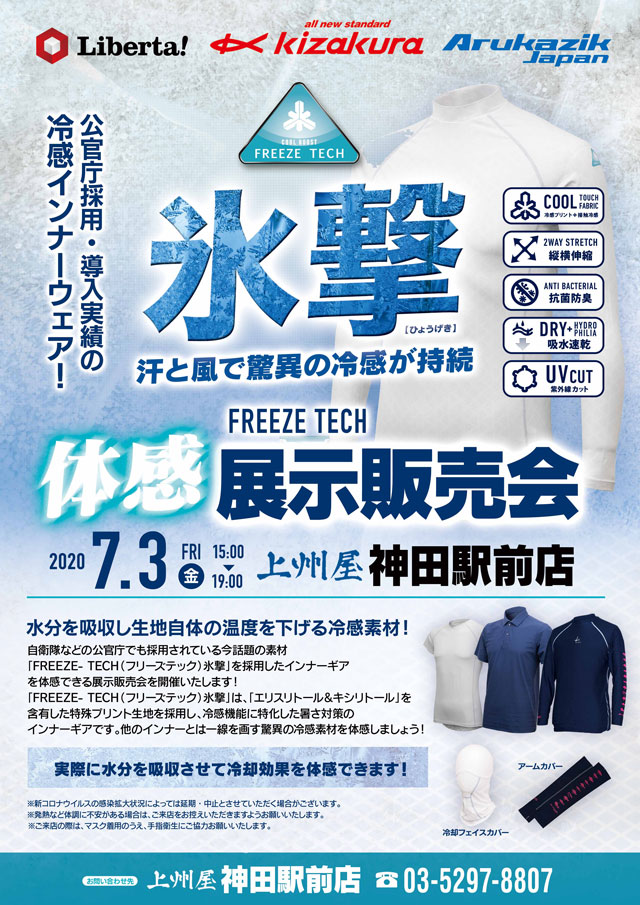 2020年7月3日(金)15:00~19:00(予定)、上州屋神田駅前店にて水分を吸収し生地自体の温度を下げる今話題の冷感素材「FREEZE TECH(フリーズテック)氷撃」を採用したインナーギアの展示即売会を開催します!自衛隊など官公庁採用・導入実績の話題の冷感インナーウェアを体感してみましょう!
