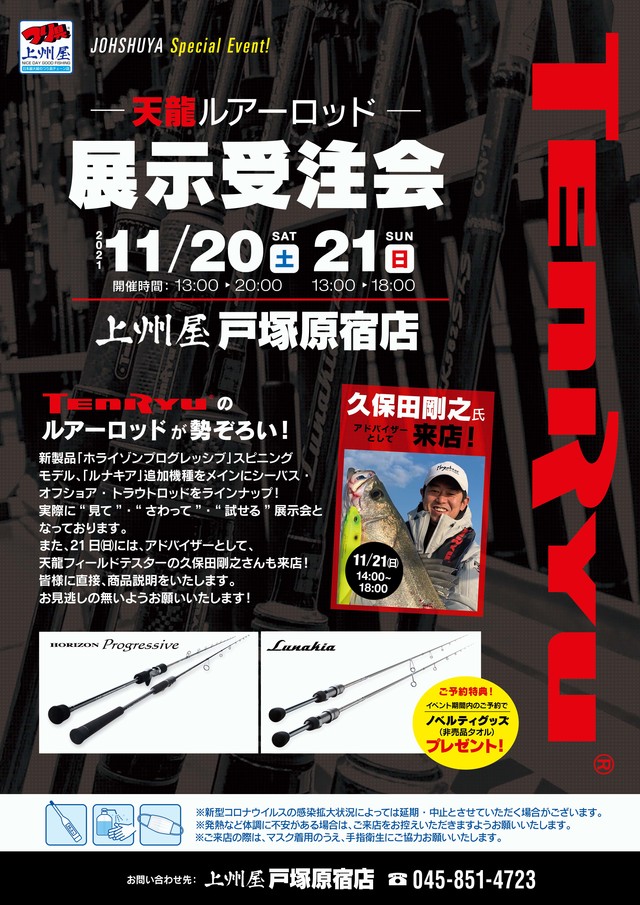 2021年11月20日(土)13:00~20:00/11月21日(日)13:00~18:00の2日間、上州屋戸塚原宿店にて天龍ルアーロッドの展示受注会を開催します!