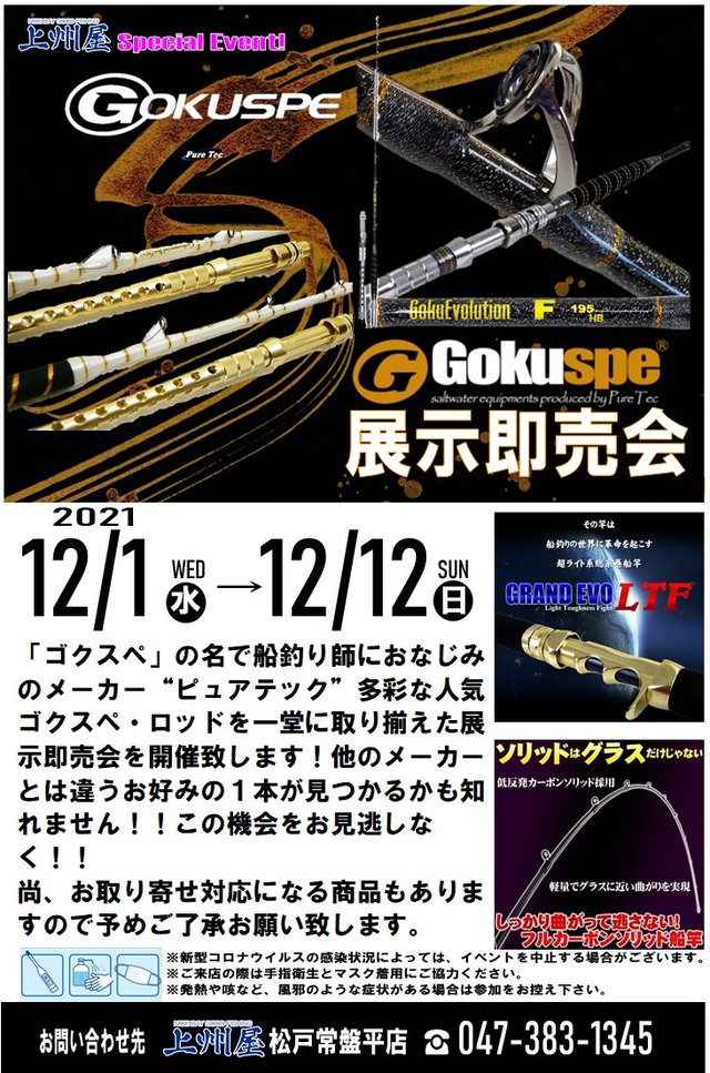 2021年12月1日(水)~12月12日()上州屋松戸常盤平店にてピュアテック「ゴクスペ」船釣りロッドの展示販売会を開催します。