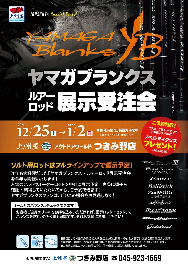 2021年12月25日(土)~2022年1月2日(日)の間、上州屋アウトドアワールドつきみ野店にてヤマガブランクス社製ルアーロッド展示受注会を開催します!