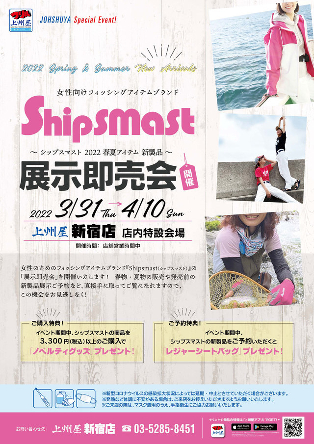 2022年3月31日(木)~4月10日(日)、上州屋新宿店にて女性のためのフィッシングウェアブランド、Shipsmast(シップスマスト)の展示即売会を開催します!