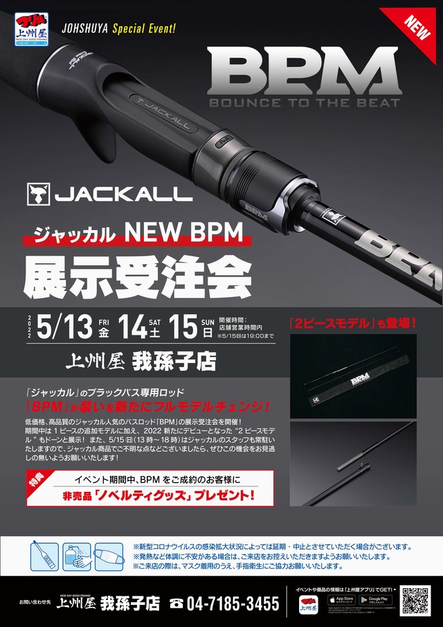 2022年5月13日(金)、14日(土)、15日(日)の3日間、上州屋我孫子店にてジャッカルのブラックバス専用ロッドNEW BPMの展示受注会を開催!5月末発売予定のBPM新機種&2ピースモデルを一挙にご覧いただけます!