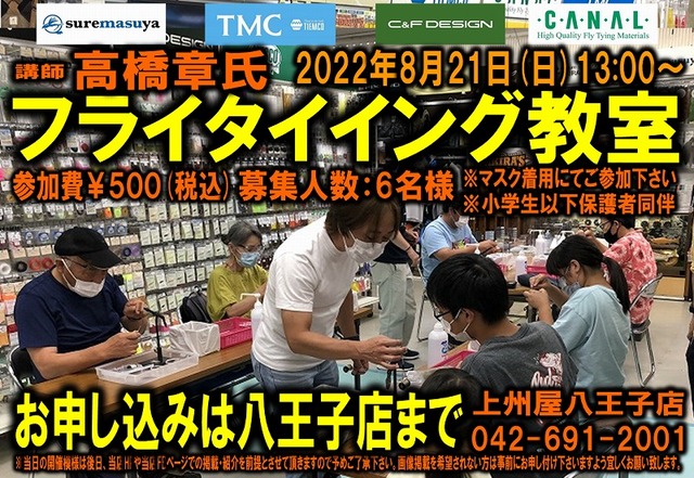 2022年8月21日(日)13:00~(予定)上州屋八王子店にて「すれ鱒屋」プロタイヤー高橋章さんを講師にお迎えして、フライタイイング・ビギナーの方を対象にした少人数制フライタイング教室を開催します!