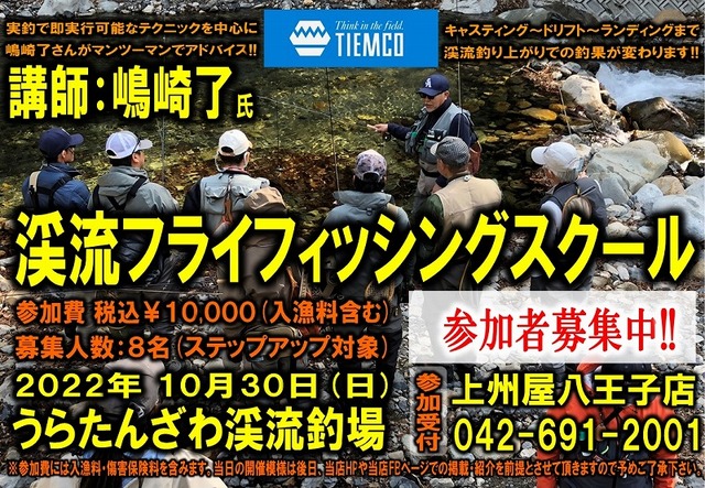 2022年10月30日(日)9:00~神奈川県の「うらたんざわ渓流釣場」にてティムコ嶋崎了さんを講師にお迎えしての少人数制渓流フライフィッシングスクールを開催します!