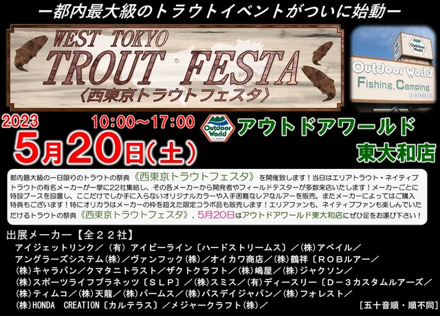 2023年5月20日(土)10:00~17:00、上州屋アウトドアワールド東大和店にて都内最大級のトラウトの祭典「西東京トラウトフェスタ」開催!