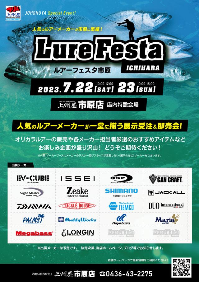 上記2日間、上州屋市原店にて人気ルアーメーカーが一堂に揃う展示受注即売ルアーフェスタ市原」を店頭開催いたします!