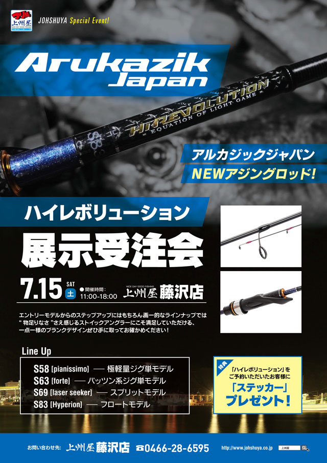 2023年7月15日(土)11:00~18:00、上州屋藤沢店にてライトソルトの人気メーカーアルカジックジャパンのNEWアジングロッド「ハイレボリューション」の展示受注会を開催します!