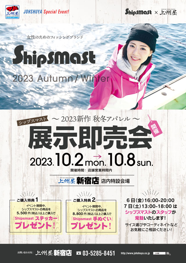 2023年10月2日(月)~8日(日)の7日間、上州屋新宿店にて女性のためのフィッシングウェアブランド、Shipsmast(シップスマスト)の展示即売会を開催します!