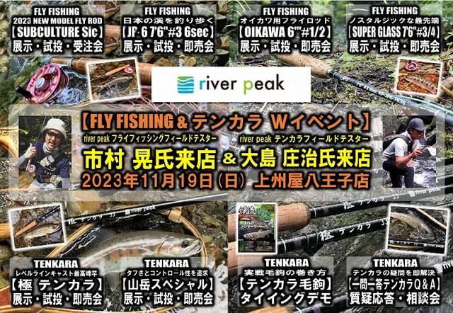 2023年11月19日(日)11:00より、上州屋八王子店にてフライフィッシング用品、テンカラ用品を扱うriver peak社によるフライフィッシングとテンカラ両方楽しめる「W」イベントを開催します!