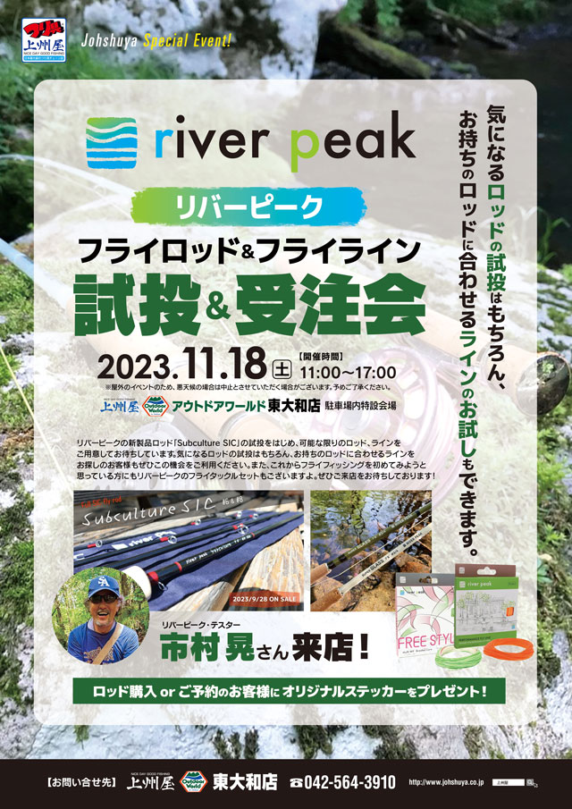 2023年11月18日(土)11:00~17:00、上州屋アウトドアワールド東大和店にて話題のフライフィッシングブランドriver peak社のフライフライロッド&フライライン試投&展示受注会を開催します!