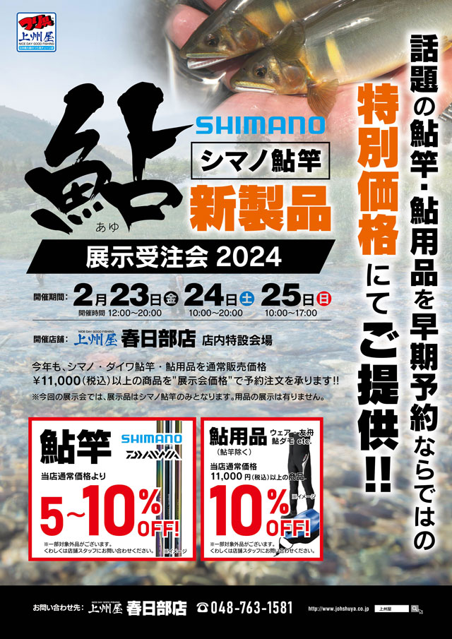 2024年2月25日(日)10:00~17:00上記3日間、上州屋春日部店にてSHIMANO鮎竿新製品展示受注会を開催します!