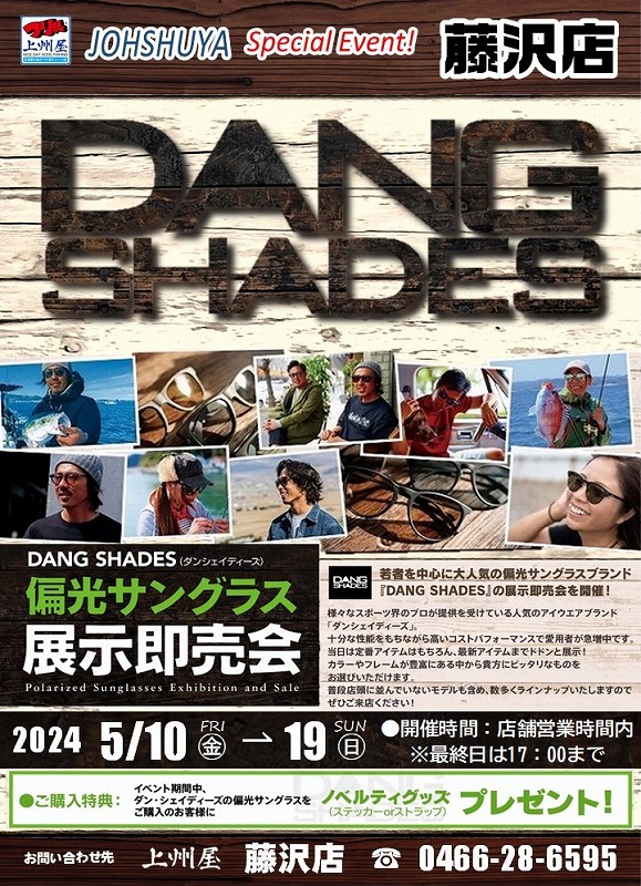 2024年5月10日(金)~19日(日)17:00までの期間中、上州屋藤沢店にてDANG SHADES(ダン・シェイディーズ)偏光グラスの展示即売会を開催します!