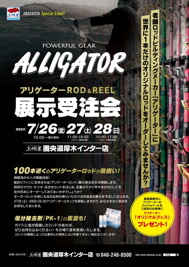 上記時間帯にはアリゲータースタッフが来店&常駐します。普段疑問に思っていることや長さ、調子、カラーの相談までお気軽にお声がけください。当日のお買い上げ特典、御注文特典なども予定しておりますので、多くのお客様のお越しをお待ちしております。