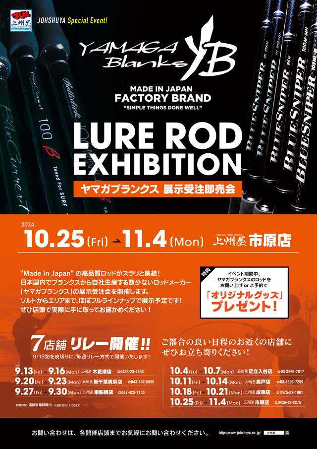 2024年10月25日(金)~11月4日(月祝)の11日間、上州屋市原店にてヤマガブランクス社製、ルアーロッドの展示受注会を開催します!
