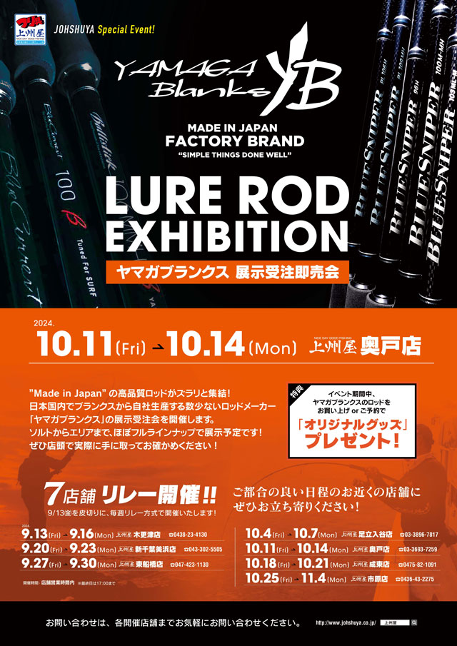 2024年10月11日(金)~14日(月祝)の4日間、上州屋奥戸店にてヤマガブランクス社製、ルアーロッドの展示受注会を開催します!