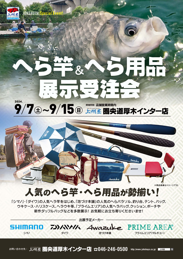 2024年9月7日(土)~15日(日)の9日間、上州屋圏央道厚木インター店にてシマノ、ダイワ、泡づけ本舗、プライムエリア(マルキユー)4社合同の「へら竿&へら用品」展示受注会を開催!
