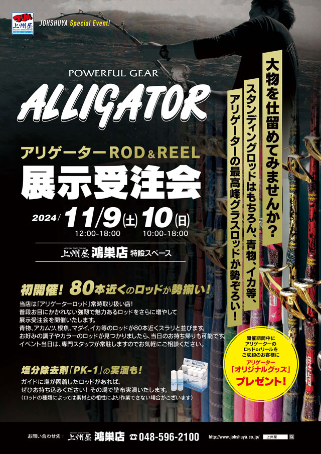 上記2日間、上州屋鴻巣店にてグラスワンピースロッドの元祖、アリゲーターロッド&リールの展示受注会を開催します!