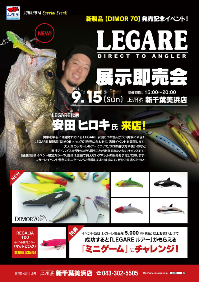 新発売のディモル70を筆頭に、様々なLEGARE(レガーレ)ルアーを展示即売!さらに普段はオンライン限定の「アパレル」もイベント限定で展示販売します!