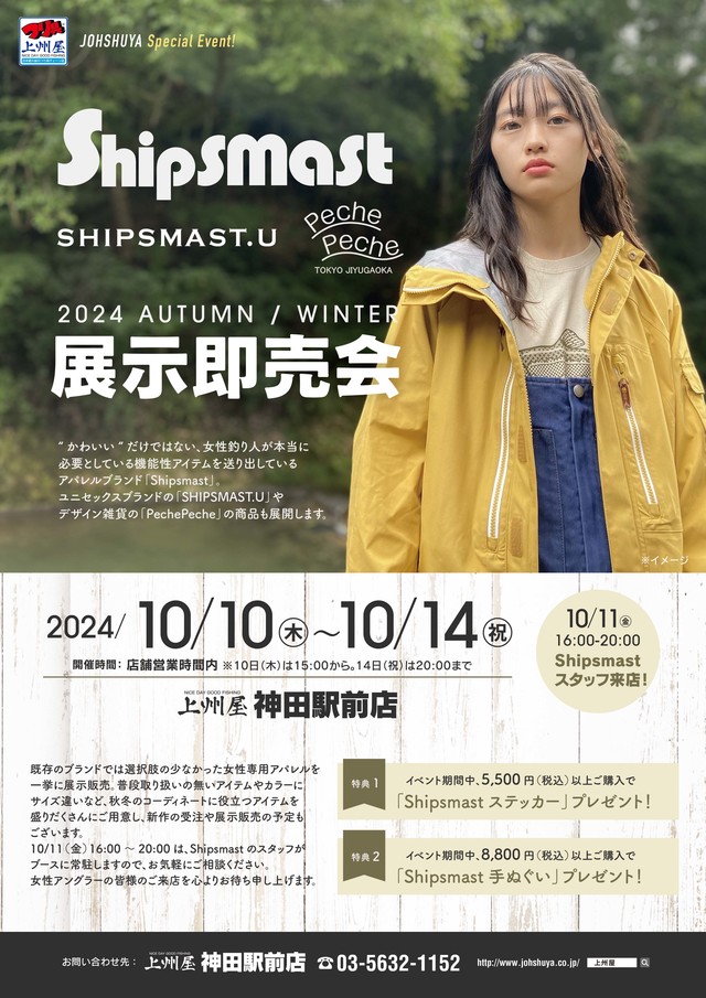 2024年10月10日(木)~10月14日(祝)の5日間、上州屋神田駅前店にて女性アングラーに人気のフィッシングウェアブランドShipsmast(シップスマスト)の展示即売会を開催します!