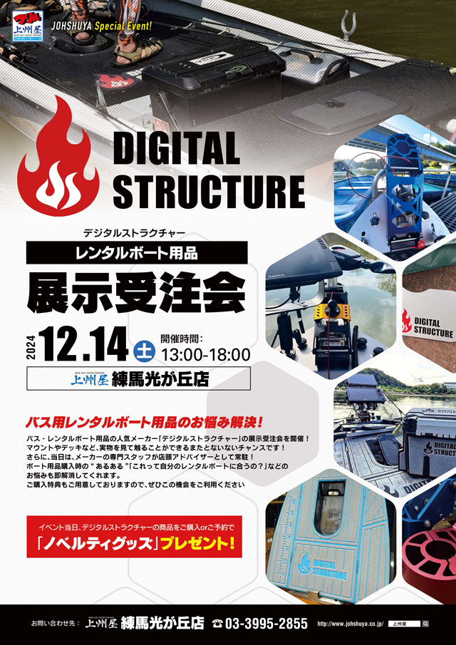 2024年12月14日(土)13:00~18:00、上州屋練馬光が丘店にてバス用レンタルボートのお悩み解決!デジタルストラクチャー展示受注会を開催します!