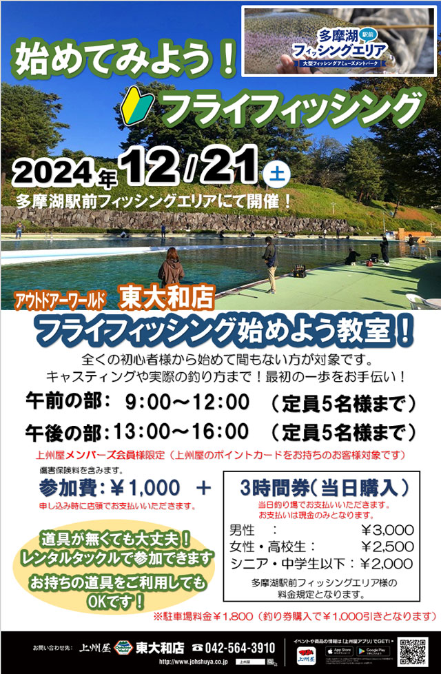 2024年12月21日(土)、車はももちろん電車でも行ける多摩湖駅前フィッシングエリアにて、始めてみようフライフィッシング教室を開催!参加者募集します!