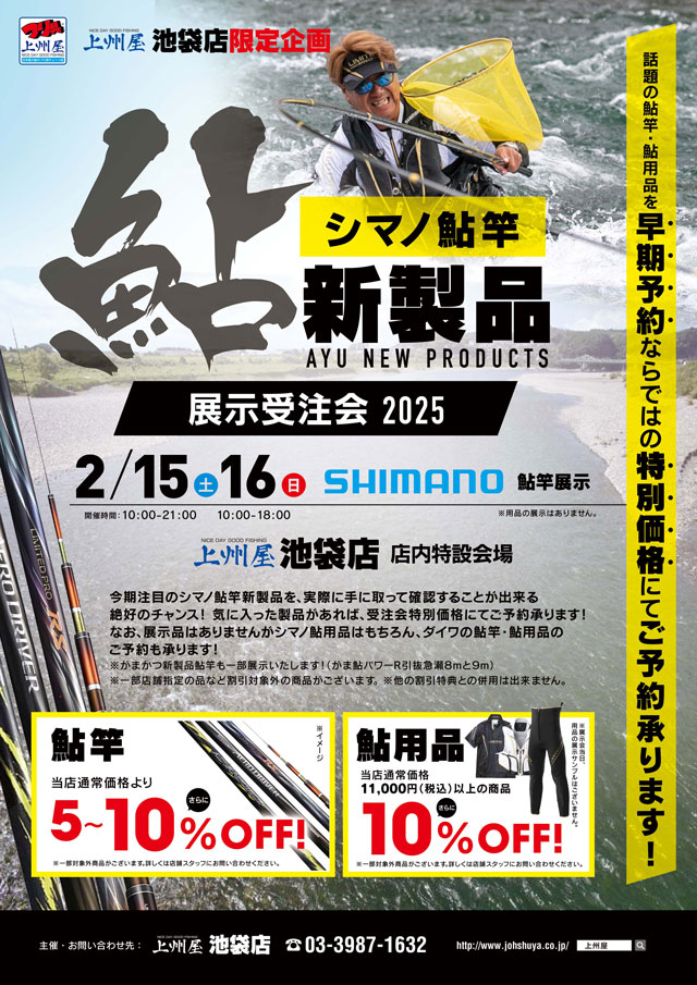2025年2月16日(日)10:00~18:00上記2日間、上州屋池袋店にてSHIMANO鮎竿新製品展示受注会を開催します!