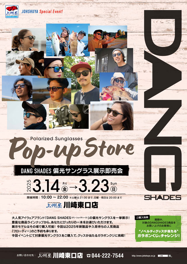 2025年3月14日(金)~3月23日(日)の10日間、上州屋川崎東口店にてDANG SHADES(ダン・シェイディーズ)偏光グラスの展示即売会を開催します!