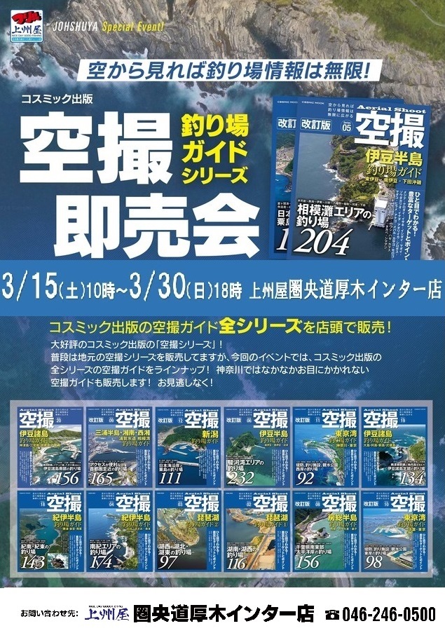 2025年3月15日(10時~3月30日(18時までの期間中、上州屋圏央道厚木インター店にてコスミック出版「空撮釣り場ガイド」シリーズの販売会を開催します!