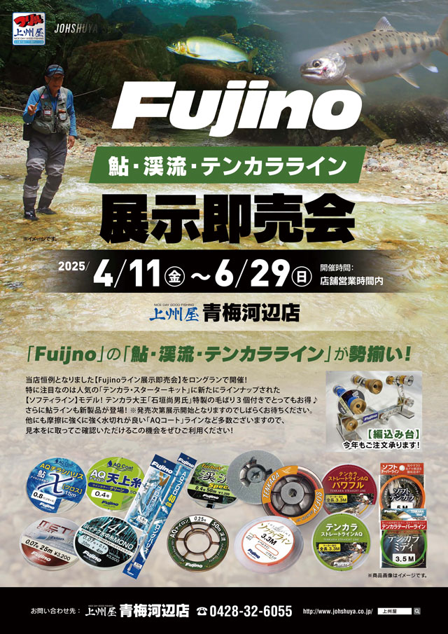 2025年4月11日(金)~6月29日(日)の期間中、上州屋青梅河辺店にてフジノライン、鮎・渓流・テンカララインの展示即売会を開催します!