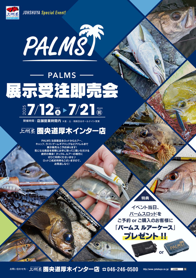 2025年7月12日(土)~21日(月・祝)の10日間、上州屋圏央道厚木インター店にて、湘南のご当地ルアーメーカー<パームス>の展示受注&即売会を開催します!