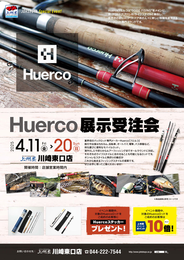 2025年4月11日(金)~20日(日)までの10日間、上州屋川崎東口店にてパックロッド専門メーカー『Huerco(フエルコ)』の展示受注会を開催します!