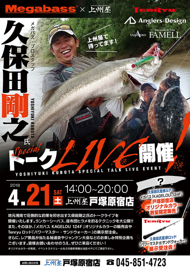 2018年4月21日(土)14:00~20:00(予定)上州屋戸塚原宿店にMegabass(メガバス)プロスタッフ久保田剛之さんが来店!ソルトルアー“トークライブ”開催します!地元湘南で圧倒的な釣果を叩き出す久保田さんのテクニックを大公開!