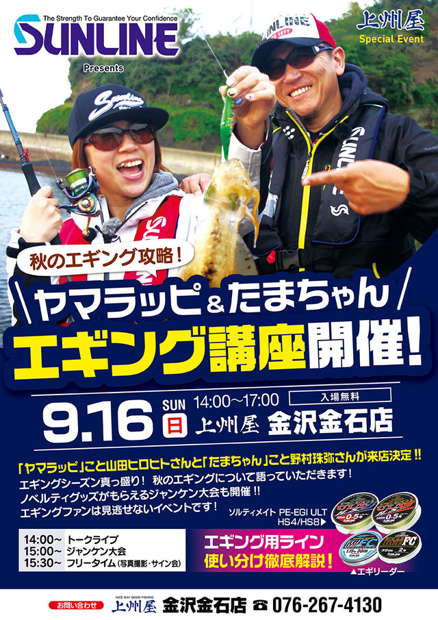 2018年9月16日(14:00~17:00、上州屋金沢金石店に“ヤマラッピ”こと山田ヒロヒトさんと“たまちゃん”こと野村珠弥さんが来店!エギングシーズン真っ盛り!秋のエギングについて語っていただきます!