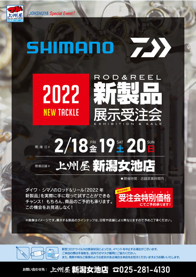 2022年2月18日(金)、19日(土)、20日(日)の3日間、上州屋新潟女池店にてシマノ・ダイワ2022年ロッド&リール新製品の展示受注会を開催します!