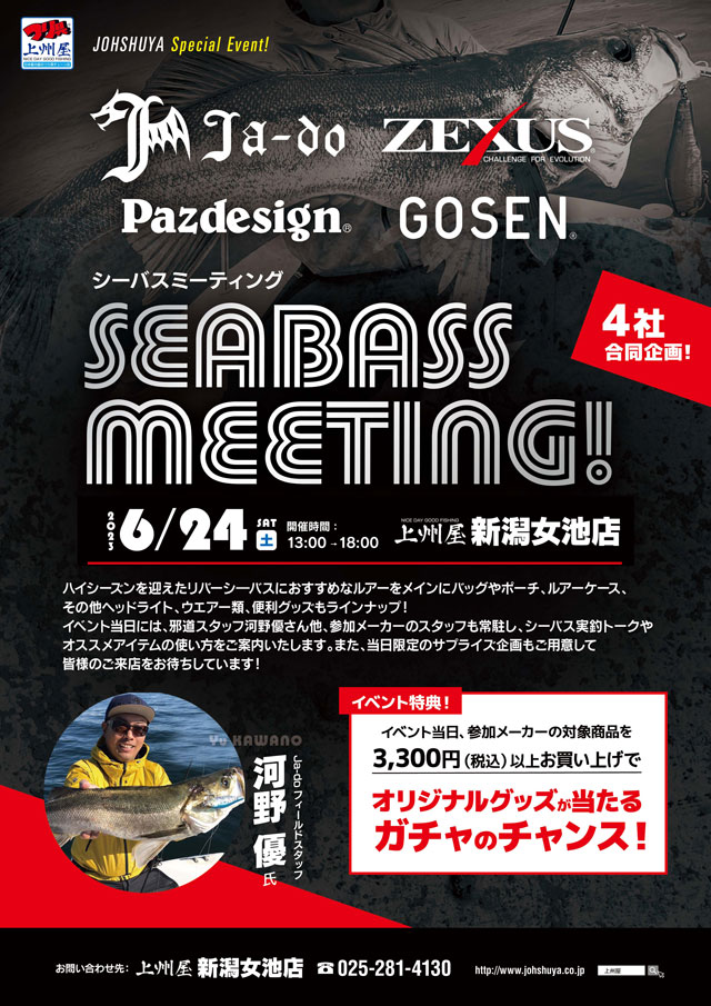 2023年6月24日(13:00~18:00、上州屋新潟女池店にてバレーヒル邪道×パズデザイン×ゼクサス×ゴーセン4社合同シーバスミーティングを開催します!